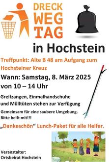 Hiermit laden wir Euch herzlich ein uns dabei zu unterstützen, den unachtsam oder gezielt unerlaubt entsorgten Wohlstandsmüll in und um Hochstein herum, einzusammeln.