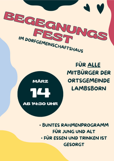 Die Ortsgemeinde Lambsborn lädt alle Bürger*innen zum Begegnungsfest im Dorfgemeinschaftshaus am 14. März 2026 ab 14.30 Uhr ein.