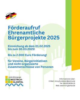 Noch bis zum 30.03.2025 können sich Vereine, lose Zusammenschlüsse und Initiativen für eine Förderung von gemeinnützigen Kleinstprojekten bei der Lokalen Aktionsgruppe Westrich-Glantal bewerben. Voraussetzung ist, dass die Umsetzung der Projekte noch nicht begonnen wurde, keine Einnahmen erzielt werden und innerhalb der Gebietskulisse der LEADER-Region liegen. Insgesamt stehen 30.000 Euro an Fördergeldern des Landes Rheinland-Pfalz zur Verfügung, diese werden unter allen eingereichten Vorhaben wettbewerblich vergeben. Informationen zur Antragstellung finden Sie auf der Webseite der LAG unter: www.westrich-glantal.de oder direkt beim Regionalmanagement: 06302 / 9239-15 nino.pfundstein@entra.de.