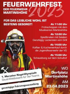 Am Sonntag, den 23. April gibt es wieder etwas in unserer Verbandsgemeinde zu feiern. Freut euch auf dem schönen Dorfplatz von Martinshöhe auf das Feuerwehrfest von uns. Ab 11:00 Uhr starten wir mit einem Frühschoppen gemeinsam mit dem Musikverein Martinshöhe / Musikverein Bruchmühlbach e.V.
