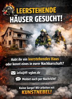 Dafür sind wir auf eure Unterstützung angewiesen: Wir suchen leerstehende Wohngebäude in unserer Verbandsgemeinde. Habt ihr selbst ein ungenutztes Haus oder kennt eines in eurer Nachbarschaft? Dann meldet euch gerne bei uns unter info@ff-vgbm.de oder direkt über unsere Social-Media-Kanäle.