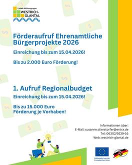 Antragsunterlagen beider Fördermöglichkeiten können noch bis zum 15. April 2026 eingereicht werden! Weitere Informationen und Antragsunterlagen finden Sie auf unserer Webseite im Downloadbereich: Downloads - LAG Westrich Glantal