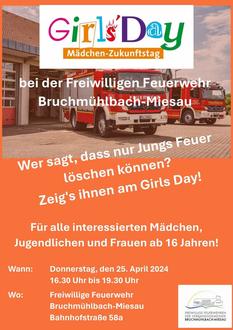 Die Freiwillige Feuerwehr Bruchmühlbach-Miesau lädt alle interessierten Mädchen, Jugendlichen und Frauen ab 16 Jahren herzlich zum „Girls Day - Der Frauen Zukunftstag“ am Donnerstag, den 25. April 2024, ein. Von 16:30 bis 19:30 Uhr (Bahnhofstraße 58a, 66892 Bruchmühlbach-Miesau) haben Besucherinnen die Möglichkeit, einen Einblick in das spannende Ehrenamt der Feuerwehr zu erhalten.