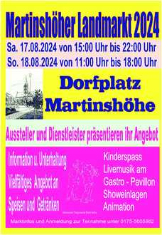 Nachdem der Landmarkt 2023 wieder sehr gut und mit viel positivem Feedback angenommen wurde, findet 2024 eine erneute Auflage des "Martinshöher Landmarktes" statt. Der Markt, der in kürzester Zeit weit über die regionalen Grenzen hinaus bekannt wurde, präsentiert wieder vielseitige und interessante Händlerangebote.