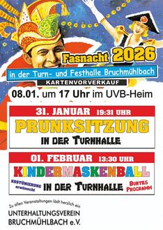 Unsere große Prunksitzung ist am 31. Januar 2026, der Kindermaskenball am 1. Februar 2026! Der Kartenvorverkauf startet am 8. Januar 2026 um 17:00 Uhr im UVB-Heim. Ab 15:30 Uhr ist das UVB-Heim geöffnet. Wer kommt, bekommt eine Nummer, nach dieser Reihenfolge erfolgt dann ab 17:00 Uhr der Vorverkauf.