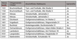 Gemäß §§ 6 und 10 KWG i.V.m. §§ 3, 8 und 9 KWO wurden in der Verbandsgemeinde Bruchmühlbach-Miesau folgende Stimmbezirke und Wahlräume bestimmt. Besondere Briefwahlvorstände und Stimmbezirke werden nicht gebildet.