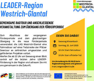 Ach ja - und für alle Sportfreunde: Wir laden alle Fahrradbegeisterten zu einer Radtour zu verschiedenen LEADER-geförderten Projekten ein. Diese beginnt um 10:00 Uhr am Seewoog in Miesenbach. Gemeinsam möchten wir eine ca. 20 km lange Tour radeln. Eingeladen sind alle Interessierten des gemütlichen Radsports. Aufgrund begrenzter Kapazitäten bei der Radtour bitten wir um eine formlose Anmeldung per Mail: marc.wagner@entra.de. Weitere Informationen finden Sie auf www.westrich-glantal.de. Wir freuen uns auf Sie!