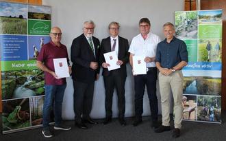 In Anwesenheit von Landrat Ralf Leßmeister sowie Mitarbeiterinnen und Mitarbeiter der Verwaltung übergab der Minister persönlich die Bewilligungsbescheide an Bürgermeister Christian Hirsch, Ortsbürgermeister Rüdiger Franz und Ortsbürgermeister Hartwig Schneider.