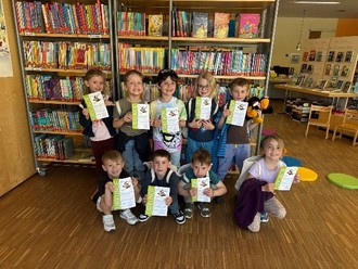 Zusammen mit Frau Pfaff, Frau Fischer und Frau Amann lernten sie das Medienangebot der Bücherei kennen. Die Kinder erfuhren bei ihren Besuchen wie Ausleihe und Rückgabe funktionieren und wie sie mit den ausgeliehenen Medien umgehen sollen. Jede der drei Einheiten wurde mit einer Vorlesegeschichte und unserem Bib-Fit-Lied „Viele bunte Bücher“ abgerundet.