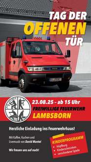Die Freiwillige Feuerwehr Lambsborn lädt euch und eure Familien herzlich zum Tag der offenen Tür ein! Am Samstag, den 23. August 2025, geht’s ab 15:00 Uhr am Feuerwehrgerätehaus in Lambsborn los - und es wartet ein abwechslungsreicher Nachmittag auf euch.