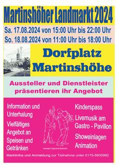 Der weit über die regionalen Grenzen hinaus bekannte Martinshöher Landmarkt wird am Samstag, 17. August um 15:00 Uhr mit einem zünftigen Fassanstich auf dem Dorfplatz in der Ortsmitte eröffnet, wozu sich auch Politprominenz angesagt hat, am Sonntag, 18. August startet die Veranstaltung um 11:00 Uhr und endet um 18:00 Uhr.