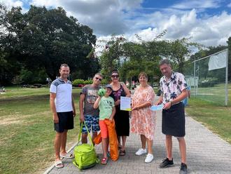 Dem strahlenden Gewinner Jakob Rusin überreichten die Beigeordnete Francesca Wagner-Heintz, die Fachkraft für Bäderbetriebe, Thomas Starck und Kioskbetreiber Patrick Lang einen Gutschein für den Freibad-Kiosk.