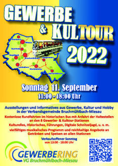 Der Gewerbering VG Bruchmühlbach-Miesau veranstaltet am Sonntag, den 11. September 2022 von 11:00 bis 18:00 Uhr seinen beliebten Gewerbe- und KulTourtag. Wir möchten Sie hierzu ganz herzlich einladen!