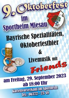 Nach dreijähriger Pause lassen wir das Oktoberfest im Sportheim wieder steigen. Am Freitag, den 29. September 2023 werden Euch wie in den Jahren zuvor die „Friends“ wieder kräftig einheizen. Bei Festbier und bayrischen Spezialitäten wollen wir mit Euch ein paar gesellige Stunden erleben!