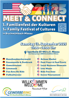 Der Gewerbering Bruchmühlbach-Miesau veranstaltet gemeinsam mit der Verbandsgemeinde Bruchmühlbach-Miesau das Event „Meet & Connect“. Am 13. September von 11 bis 18 Uhr heißt es rund um das Sportheim im Ortsteil Miesau Kontakte knüpfen und das Band der deutsch-amerikanischen Freundschaft weiter stärken.