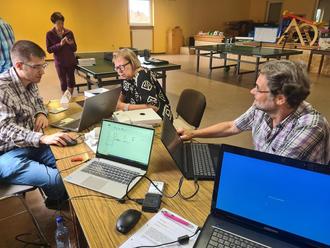 Tobias Decker und Mirjam Marotte vom Arbeitskreis Digitales beantworteten auch diesmal wieder Fragen rund um Technik und Software. Mit dabei war auch der Fall der letzten Handyhilfe im Juli. Die rund 20 Jahre alte Festplatte aus dem defekten Laptop konnte nun mithilfe von speziellem Equipment erfolgreich ausgelesen werden, was den Besitzer sehr freute. Auch betagtere Tablets, die keine USB-Sticks lesen konnten oder Handys, deren Akku nicht mehr so recht halten wollte, waren an diesem Nachmittag mit von der Partie.