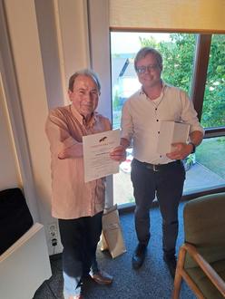 Bürgermeister Christian Hirsch verabschiedete das ausgeschiedene Ratsmitglied Fritz Hellriegel. Er bedankte sich mit einer Urkunde des Gemeinde- und Städtebundes sowie der Verbandsgemeinde und einem Präsent für die 34jährige Tätigkeit als Ratsmitglied und Beigeordneter sowohl in der Verbandsgemeinde, als auch in der Ortsgemeinde Lambsborn.