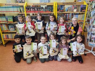Zusammen mit Frau Pfaff lernten die Kinder das Medienangebot der Bücherei kennen. Sie erfuhren, wie Ausleihe und Rückgabe funktioniert und wie man mit den ausgeliehenen Medien umgehen sollte.