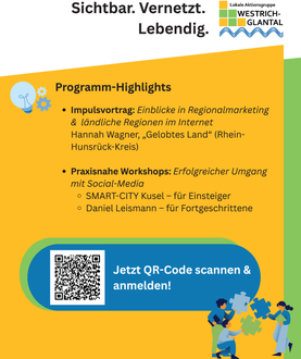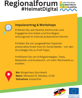 Die Lokale Aktionsgruppe (LAG) Westrich-Glantal lädt am 8. Oktober 2025 herzlich zum Regionalforum #HeimatDigital ins Bürgerhaus Quirnbach ein. Ziel der Veranstaltung ist es, Vereine, Kommunen sowie engagierte Bürgerinnen und Bürger dabei zu unterstützen, ihr Engagement, ihre Arbeit und unsere Region im Internet wirkungsvoll zu präsentieren. Zudem werden wertvolle Impulse zum Umgang mit Social Media und Regionalmarketing vermittelt.