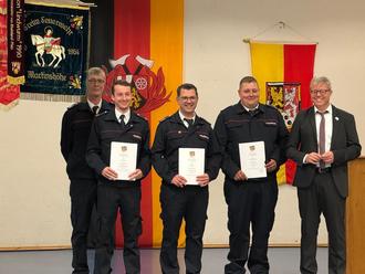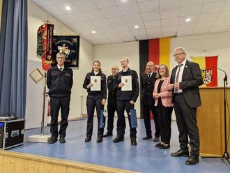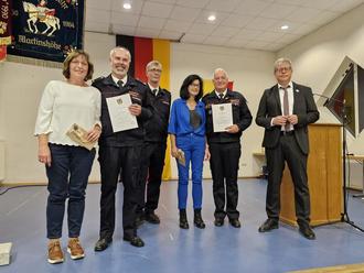 Darüber hinaus wurden sechs Feuerwehrangehörige mit neuen Funktionen betraut, d.h. diese übernehmen künftig zusätzliche Verantwortung innerhalb ihrer Einheiten. Die Landesehrungen für 15 und 25 Jahre aktiven Feuerwehrdienst wurden durch Bürgermeister Christian Hirsch, die 1. Kreisbeigeordnete, Frau Gudrun Heß-Schmidt, gemeinsam mit dem Brand- und Katastrophenschutzinspektor des Landkreises Kaiserslautern, Herrn Michael Herfurt sowie dessen Stellvertreter Matthias Hecktor, vorgenommen.