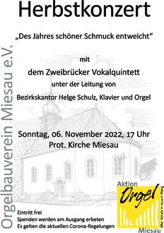 Ein Herbstkonzert erklingt am Sonntag, dem 6. November, 17:00 Uhr, in der protestantischen Kirche Miesau unter dem Titel „Des Jahres schöner Schmuck entweicht“. Das Zweibrücker Vokalquintett mit Barbara Buhr, Ina Kaufmann, Dagmar und Robert Metz und Helge Schulz betrachtet die Jahreszeit vor allem aus dem Blickwinkel des Kirchenjahres mit Erntedank, Vergänglichkeit und Auferstehungshoffnung, Licht und Dunkelheit. Auch weltliche Lieder aus England und Deutschland sind Teil des ca. einstündigen Programmes.