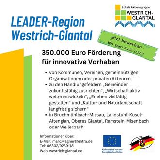 Mit Beschluss des Vorstands der Lokalen Aktionsgruppe (LAG) Westrich-Glantal wurde der erste Aufruf zur Einreichung von Projektvorschlägen bei der Lokalen Aktionsgruppe (LAG) Westrich Glantal noch einmal verlängert. Der neue Stichtag ist nun der 22.12.2023, sodass für alle Ideen und Vorhaben, die zur positiven Entwicklung der LEADER-Region beitragen, weiterhin die Möglichkeit besteht, sich um eine Förderung zu bewerben. Die Höhe des Aufrufs bleibt mit 350.000 € gleich, davon werden 50.000€ Landesmittel bereitgestellt, welche in erster Linie für nicht-kommunale Vorhabenträger zur Verfügung stehen.