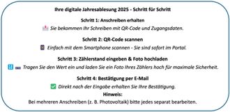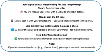 The letter will contain a QR code that will take you directly to the online portal. Your meter will already be correctly assigned there - mix-ups are impossible. After entering your meter reading, you will immediately receive a confirmation email.