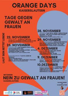 „Orange Days - Stoppt Gewalt gegen Frauen“ - Mit diesem Titel finden vom 25. November bis 10. Dezember Aktionstage mit den Schwerpunkten Menschenrechtsverletzungen und Femiziden statt. Das knallige Orange als Leitfarbe der Kampagne symbolisiert dabei die Hoffnung auf eine helle und optimistische Zukunft ohne Gewalt.
