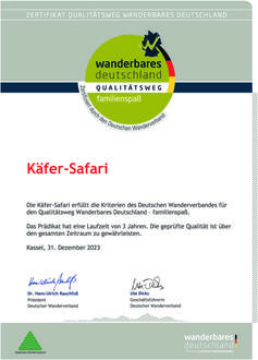 Am Montag, den 15.01.2024 war die Verbandsgemeindeverwaltung im Rahmen zur Verleihung der Zertifizierungsurkunde auf der Reisemesse CMT in Stuttgart eingeladen. Nach erfolgreicher Prüfung durch den Deutschen Wanderverwand besteht das Prädikat als Qualitätswanderweg nun erneut für drei weitere Jahre. Die Käfer-Safari erhielt somit die erste Nachzertifizierung seit seiner Erschließung und Neuzertifizierung im Jahr 2020.