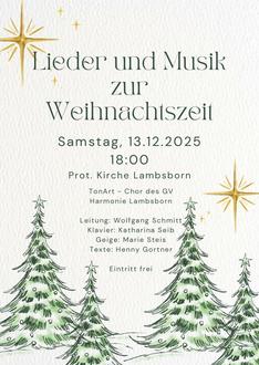 Am Samstag, den 13.12.2025 findet um 18:00 Uhr in der protestantischen Kirche in Lambsborn das diesjährige Adventskonzert des Chores „TonArt“ unter der Leitung von Wolfgang Schmitt statt.
