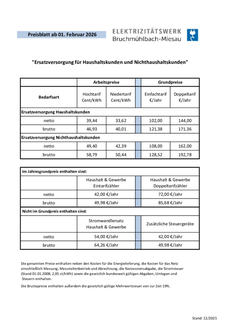 Die Bundesregierung hat für das Jahr 2026 die verschiedenen Abgaben und Umlagen, die den Strompreis beeinflussen, in Summe um 0,295 ct/kWh erhöht. Des Weiteren haben die Übertragungsnetzbetreiber die Netzentgelte aufgrund der geforderten Netzstabilität und des Vorantreibens der Klimaneutralität und des Zuschusses durch die Bundesregierung gesenkt, so dass diese sich auch auf die des E-Werkes Bruchmühlbach-Miesau durchschlagen. Dies führt zu einer Senkung von 2,376 ct/kWh.