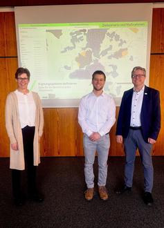 V.l.n.r.: Barbara Käufling, Sachbearbeiterin Stabsstelle Energie und Wirtschaft, Dr. Kai Mainzer, Gründer und Leiter Forschung & Entwicklung bei Greenventory GmbH, Bürgermeister Christian Hirsch