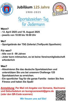 Anlässlich des 125-jährigen Jubiläums der TSG Zellertal in diesem Jahr lädt der Verein alle Sportbegeisterten und Neugierigen ein, an der Jubiläums-Challenge teilzunehmen. Ziel der Challenge ist es, 125 Personen zu motivieren das Deutsche Sportabzeichen zu absolvieren.