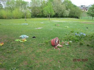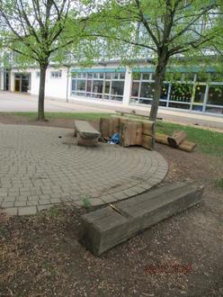 Alle komplett aufgestellten Sitzgelegenheiten und Bänke wurden umgeschmissen und teilweise zerstört. Von den Kindern der Schule gefertigte Windspiele, welche im Bereich des Pausenhofes ausgestellt waren, wurden alle abgerissen und zerstört. Mülleimer wurden aus den Verankerungen gerissen bzw. getreten.