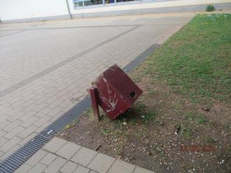 Ein aus der Verankerung gerissener/getretener Mülleimer