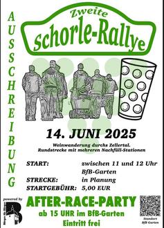 Bürger für Bürger e. V. veranstaltet zum 2. Mal die Weinwanderung im Zellertal. Start ist am 14.06.2025 zwischen 11:00 Uhr und 12:00 Uhr im Bürgergarten Zellertal-Harxheim, Kurpfalzstr. links vor der Eisenbahnbrücke. Mehrere Stationen können angesteuert werden. Der Abschluss findet ab 15:00 Uhr für Teilnehmer und Nicht-Teilnehmer im BfB-Garten statt.
