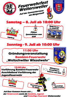 Am 8. und 9. Juli lädt der Förderverein Freiwillige Feuerwehr Weitersweiler e.V. und die Feuerwehr Weitersweiler zum diesjährigen Feuerwehrfest auf die Sonnenterasse am Bürgertreff ein.
