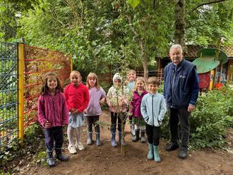 Bei sonnigem Wetter und fröhlicher Stimmung versammelten sich Kinder, Kolleginnen und Kollegen im Außengelände der Kita um zusammen mit Herrn Mattern das Bäumchen einzupflanzen.