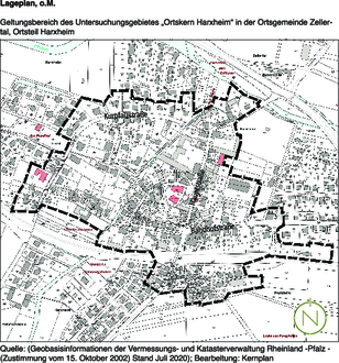 | (1) | Der räumliche Geltungsbereich des Sanierungsgebietes umfasst alle Grundstücke und Grundstücksteile innerhalb der im anliegenden Lageplan ((Geobasisinformationen der Vermessungs- und Katasterverwaltung Rheinland -Pfalz - (Zustimmung vom 15. Oktober 2002) Stand: Juli 2020) durch eine Umgrenzungslinie abgegrenzten Fläche. Der Lageplan ist Bestandteil der Satzung und wird zu jedermanns Einsicht bei der Verbandsgemeindeverwaltung während den allgemeinen Dienststunden bereitgehalten. |