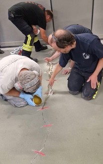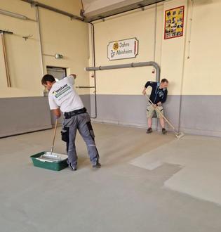 Nachdem in den vergangenen Jahren immer mehr Risse in der alten Beschichtung aufgetaucht sind, war eine Neubeschichtung erforderlich. Um Kosten zu sparen, wurde im Kreise der Feuerwehr Albisheim beschlossen die Neubeschichtung in eigener Regie durchzuführen. Für die Verbandsgemeinde Göllheim fielen ausschließlich die Kosten für das erforderliche Material an. Unter der Leitung des „Bauleiters“ Thorsten Deißler der als Maurermeister die erforderliche Sach- und Fachkompetenz mit einbrachte wurde freitags die Fahrzeughalle leer geräumt und die Halle abgeklebt. Die Risse im Boden wurden mit der Flex geöffnet und mit Spezial Harz und Rissankern vergossen. Samstags wurde der komplette Boden mit Schleifmaschinen bearbeitet, um die alte Beschichtung zu entfernen. Abends konnte sogar noch der erste Anstrich und das Einsanden der Fläche durchgeführt werden. Am Sonntagmorgen ging es dann zeitig weiter mit den Arbeiten. Zuerst wurde der lose Quarzsand abgekehrt und die Fläche komplett abgesaugt, um dann die endgültige Beschichtung aufzubringen. Montagabends wurde schließlich der Endanstricht durchgeführt. Nachdem die Beschichtung am darauffolgenden Samstag so weit trocken war, konnte die Fahrzeughalle grundgereinigt werden. Die Einsatzfahrzeuge konnten wieder auf ihren Stellplätzen abgestellt werden. An dieser Stelle auch ein großes Dankeschön an unsere Nachbarn die die Lärmbelästigung während der Arbeiten toleriert und ertragen haben.