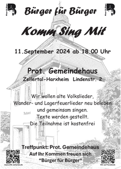 Bürger für Bürger lädt für den 11.09.24 ab 18.00 Uhr zum gemeinsamen Singen ins Prot. Gemeindehaus Zellertal-Harxheim ein. Wir wollen alte Volkslieder, Wander- und Lagerfeuerlieder neu beleben.