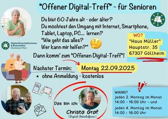 *Digital-Botschafterin (zertifiziert/RLP) Christa Graf bietet an: *Offener Digital-Treff für Seniorinnen/Senioren* - jeden 2. und 4. Montag im Monat (14:00 Uhr bis 16:00 Uhr) - im Haus Müller/Göllheim (Hauptstr. 35)!