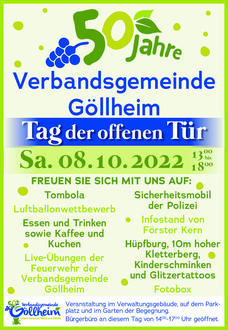 die Verbandsgemeinde Göllheim und damit auch die Verbandsgemeindeverwaltung feiert in diesem Jahr ihr 50jähriges Bestehen. Zu diesem Anlass öffnen wir die Türen der Verwaltung für den Blick hinter die Kulissen. Am Samstag, den 8. Oktober 2022, 13.00 Uhr bis ca. 18.00 Uhr laden wir Sie zum „TAG der offenen TÜR“ ein.