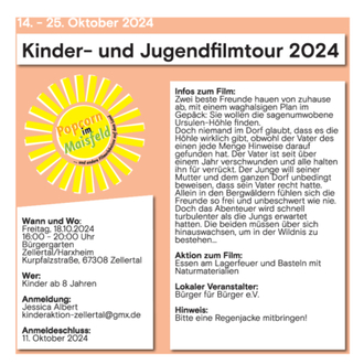 Mitte Oktober tourt die Kinder- und Jugendfilmtour zum bereits 18. Mal durch Rheinland-Pfalz und macht am 18. Oktober in Zellertal Station. Der Bürger für Bürger e.V lädt in ein beheiztes Zelt im Bürgergarten ein.