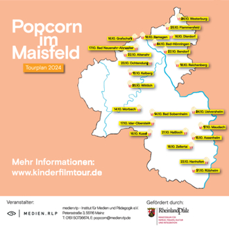 Filmerlebnisse an kinolosen Orten vermitteln und dabei zugleich die pädagogisch begleitete Filmarbeit in Rheinland-Pfalz beleben – das ist „Popcorn im Maisfeld“. Begleitet werden die Filmvorführungen deshalb von Spiel-, Bastel- und Erlebnisaktionen.