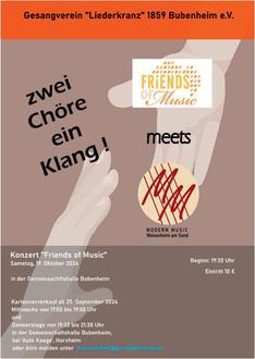 Am Samstag, 19. Oktober 2024, 19.30 Uhr geben die Chöre „Friends of Music“, GV Liederkranz 1859 Bubenheim e. V. und „Modern Music “, GV Liedertafel 1846 e. V. Weisenheim am Sand in der Bubenheimer Gemeinschaftshalle ein gemeinsames Konzert.