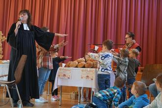 Am Sonntag feierten wir im Bürgerhaus ein richtig schönes gemeinsames Erntedankfest. Gestartet wurde mit einem gemeinsamen Gottesdienst unter der Leitung von Pfarrerin Ulrike Wahl-Risser. Sehr kurzweilig und kindgerecht wurde hier das „Danke sagen“ thematisiert und mit passenden Liedern eingerahmt. Gemeinsam mit den Kindern wurde Abendmahl gefeiert und die Erntedank Brote der Landfrauen gesegnet.