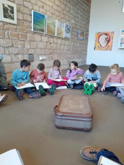 „Guck mal, da liegt ja ein Koffer!“ Die Augen der Vorschulkinder der Friedrich-Fröbel-Kita werden ganz groß, als sie die Kulturscheune mit der Ausstellung von Klaus-Dieter und Anna-Katharina Magsig in Göllheim betreten. „Das ist Kurt, der Kunstkoffer“ stellt Kunsthistorikerin Annika Treiber den Kindern den Koffer vor, als alle gemeinsam im Kreis sitzen. Nachdem die Kinder gemeinsam mit ihren Erzieherinnen Ekaterina Eske und Leyla Capan erfahren haben, wo sie hier eigentlich sind, was eine Ausstellung ist und warum die Bilder hier hängen, geht es gemeinsam zum Anschauen der Kunstwerke. Dafür klappt Kurt, der Koffer, nach ein bisschen Deckel-streicheln und gut zureden – er ist nämlich ein sensibler Koffer, den man nicht einfach so am Griff ziehen darf – seinen Deckel auf, und jedes Kind bekommt einen bunten Stein, um sein persönliches Lieblingsbild zu markieren.