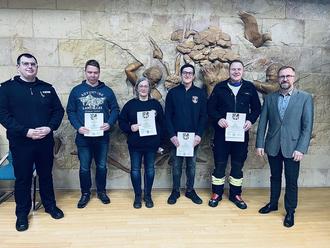 v.r.n.l. stv. Wehrleiter Manuel Fischer, Paul Schütze, Petra Kunz, David Kunz, Jan Bayer, Bürgermeister Steffen Antweiler