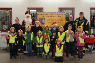 Am 6. Dezember hatten sich die Kinder der Weitschwiller Wieselwehr zu einer Übung getroffen. Anlässlich des Nikolaustages wurde die Übung kurzerhand in eine kleine Nikolausfeier mit Muffins, Lebkuchen und Kinderpunsch umgestaltet. Zusammen mit der dazugestoßenen Jugendfeuerwehr haben die Bambinis die Übungsstunde mit verschiedenen Spielen verbracht. Parallel dazu wurde durch die Jugend- und Bambini-Betreuer das „6. Weitersweilerer Adventsfenster“ vorbereitet, welches an diesem Abend um 18:00 Uhr am Feuerwehr Gerätehaus stattfinden sollte. Das Gerätehaus musste geputzt, die Getränke und das Essen vorbereitet und der „Offizielle Teil“ geprobt werden. Letzteres bestand aus zwei weihnachtlichen Liedbeiträgen und einer Geschichte, die den Rahmen des Adventsfensters vor vielen Dorfbewohnern bilden sollte. Kurz vor 18 Uhr, die Kinder waren gerade noch am Proben, kam plötzlich der Nikolaus vorbei, was zum Staunen der Kinder führte. Er setzte sich zu ihnen und lies sich im Gespräch mit den Kindern von der Bambini- und Jugendarbeit in Weitersweiler berichten. Natürlich hatte der Nikolaus für jedes Kind auch ein kleines Päckchen dabei, was er an die fleißig berichtenden Kinder austeilte.